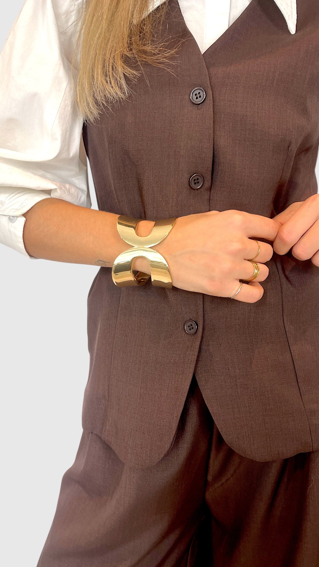Bracciale rigido realizzato in metallo dorato lucido dal design scultoreo e contemporaneo, caratterizzato da una lavorazione a intagli geometrici che lo rende un accessorio statement capace di valorizzare anche i look più semplici. Leggero ma d'impatto, è il dettaglio perfetto per chi cerca un gioiello moderno e sofisticato.