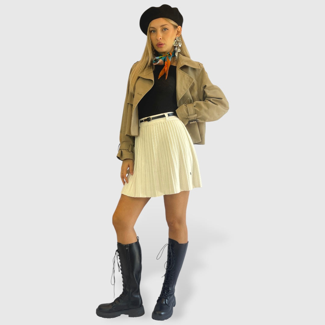 Gonna plissettata in morbida maglia, caratterizzata da vita alta e linea svasata per un look femminile e versatile. La cintura sottile in vita aggiunge un tocco di eleganza e permette di valorizzare la silhouette con stile. Perfetta da abbinare a maglioni oversize o camicie per outfit casual-chic ideali in ogni occasione. La variante bianca dona luminosità e raffinatezza, rendendola un capo immancabile nel guardaroba di stagione.