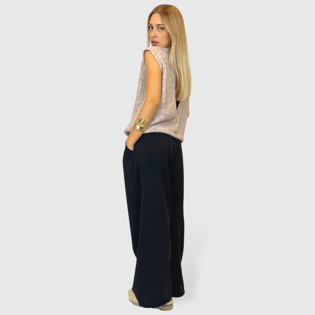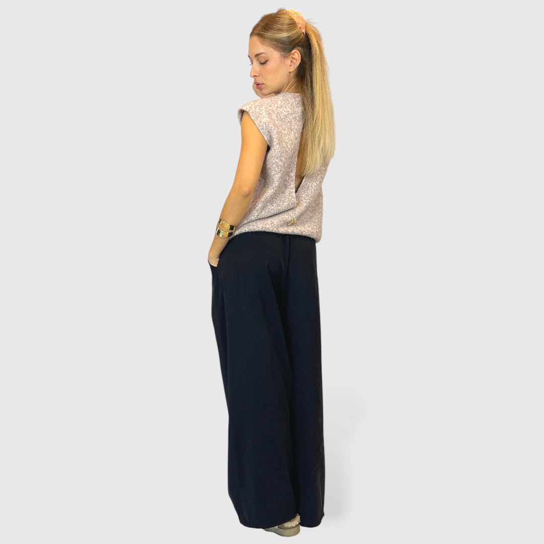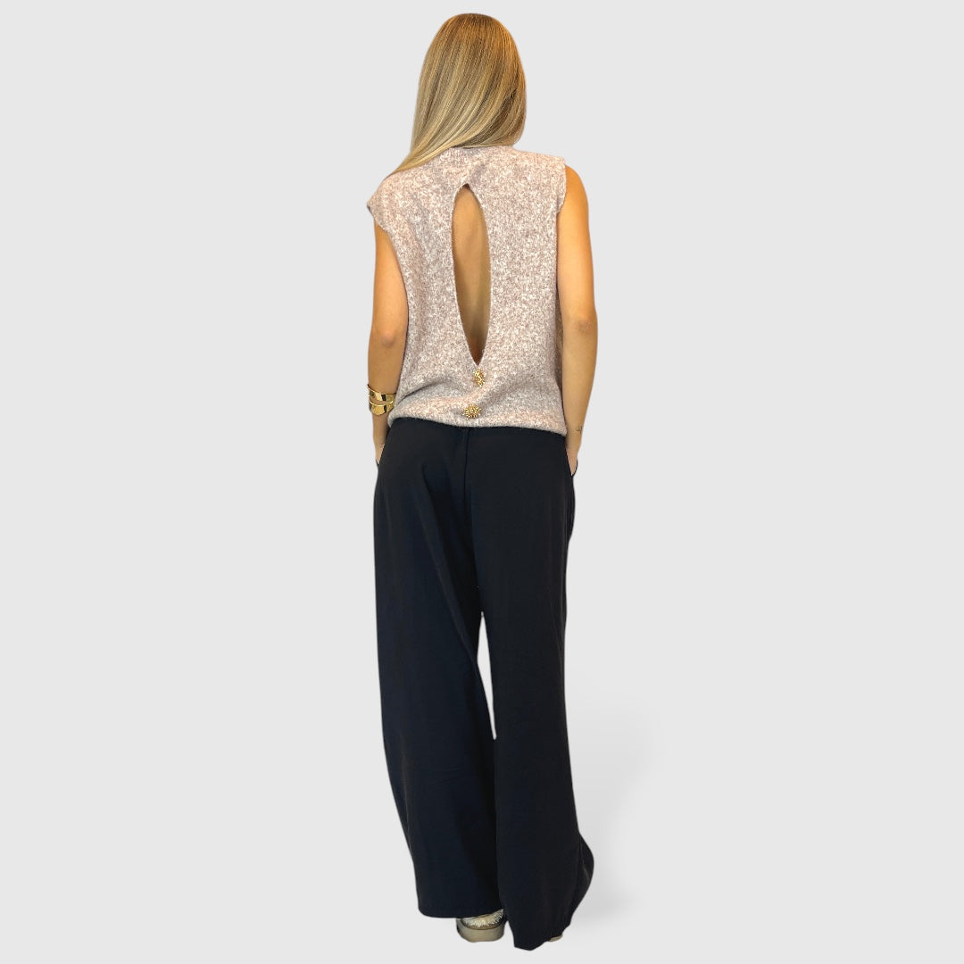 Questo smanicato in maglia soffice e leggera è un capo moderno e ricercato che unisce semplicità e sensualità. Sul davanti si presenta con una linea essenziale e pulita, perfetta da abbinare a pantaloni o gonne, mentre il retro rivela un dettaglio sorprendente: una profonda apertura centrale che lascia la schiena in evidenza, chiusa da piccoli bottoni gioiello che donano un tocco elegante e luminoso. La vestibilità è morbida e versatile grazie alla taglia unica che si adatta facilmente a diverse fisicità. Un capo originale e sofisticato, ideale per look sia da giorno con blazer e denim sia da sera con pantaloni fluidi o gonne dal taglio elegante.